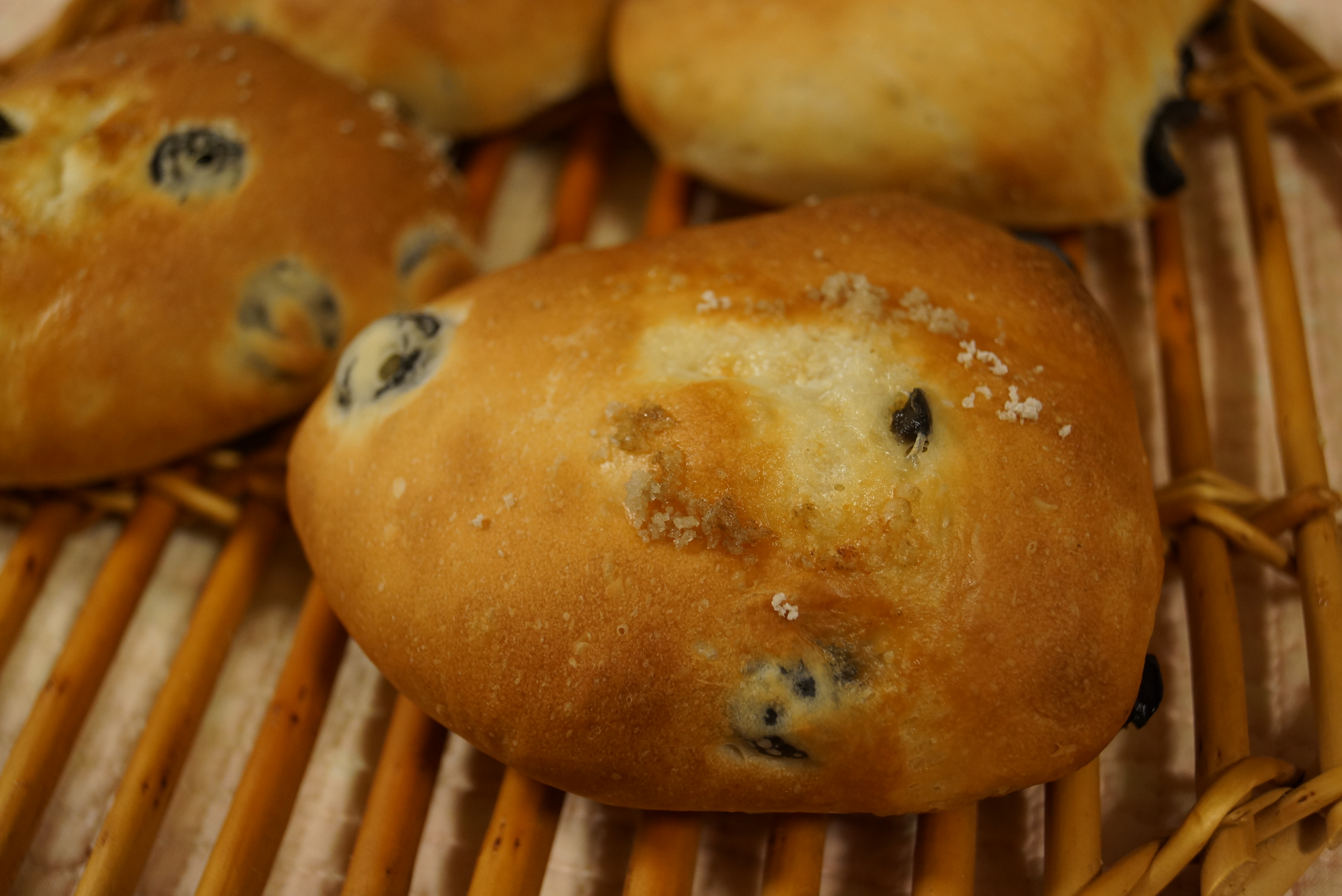 生地にブラックオリーブをたっぷり入れて仕上げるパン。仕上げに岩塩をふりかけてパスタなどに相性抜群/4個