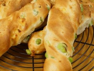 2016年7月のパン 枝豆バター 生地はフランスパン専用粉を使います 生地の中には枝豆とチーズをたっぷり 焼成前にバターと岩塩を乗せることで表面がパリッと仕上がります コーンポタージュ 生地にコーンクリーム&コーンホールをたっぷりたっぷり入れます コーンのほんのりとした甘みがなんとも言えません! お子さんが好きな味だと思います(^^) サクもち食パン 今回は油脂分をいれずに仕上げます 生地量も多いのでコネの見極めが少々難しいですがコネ応え十分です トーストしていただくと表面がかりっとなりますが中はもっちもちで独特の食感を楽しめるパンです 紅茶ブレッド 生地の中にアールグレーの茶葉をいれるのでとても風味の良いパンです 焼成するとアールグレーの香りが漂い「お茶」したくなります 成形でオレンジピールを包仕上げにレモンアイシングをかけることでさっぱりとした味に仕上がります