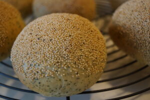 宇治抹茶を練りこんだ生地に白玉とあんこ。パンだけどモチモチで表面のけしの実が香ばしいです