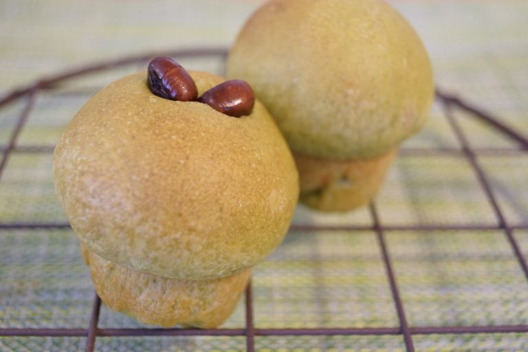 抹茶味の生地にあんことクリームチーズを包こみ、かわいいキノコ型に入れて抹茶キノコを作ります