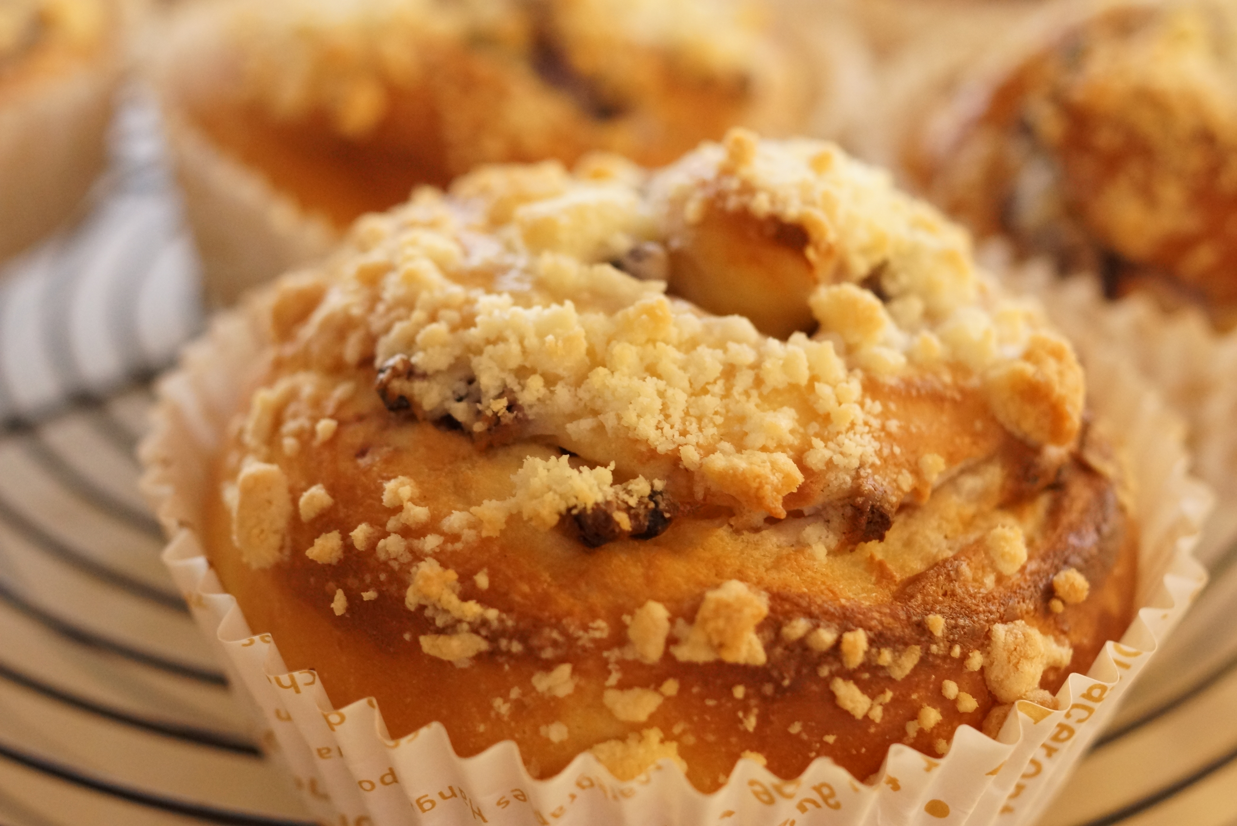 卵、バターたっぷりな生地にブルーベリークリームを包み込みクッキー生地を乗せて焼き上げます