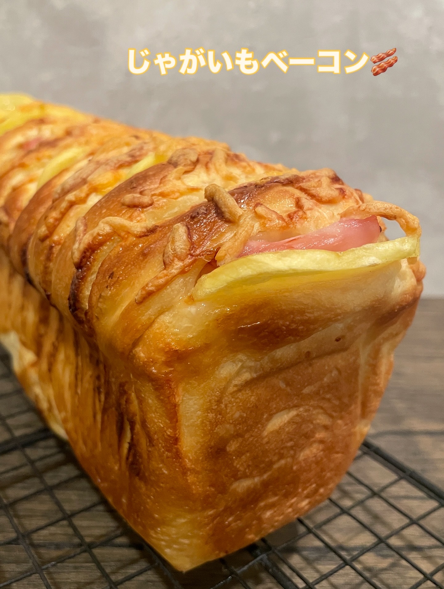 ふんわり生地にサクサクアーモンドを包み込み生地の間にじゃがいもとベーコンを挟みます