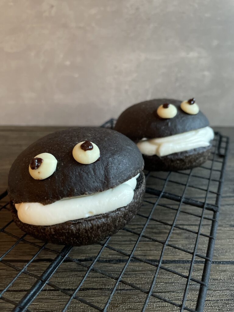 ブラックココア生地で仕上げたお顔にクリームを挟んでオバケ仕様に☆