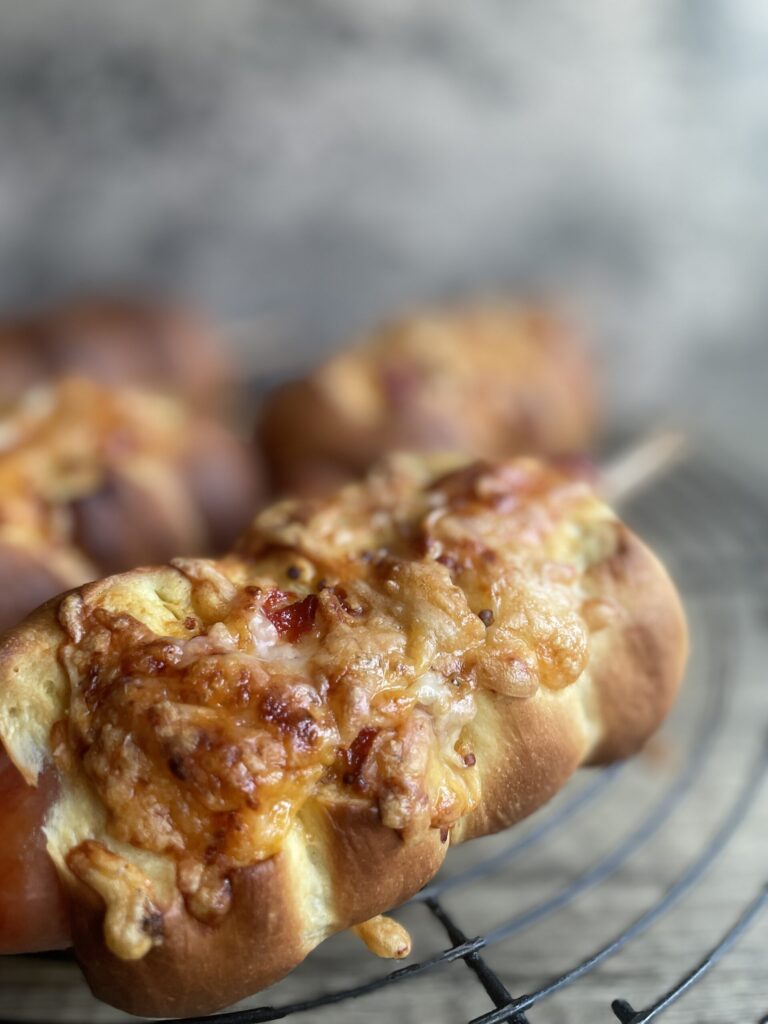リスドォルで捏ねた生地にねぎをたっぷりとベーコンを乗せて巻き巻き。きざみ生姜がアクセント