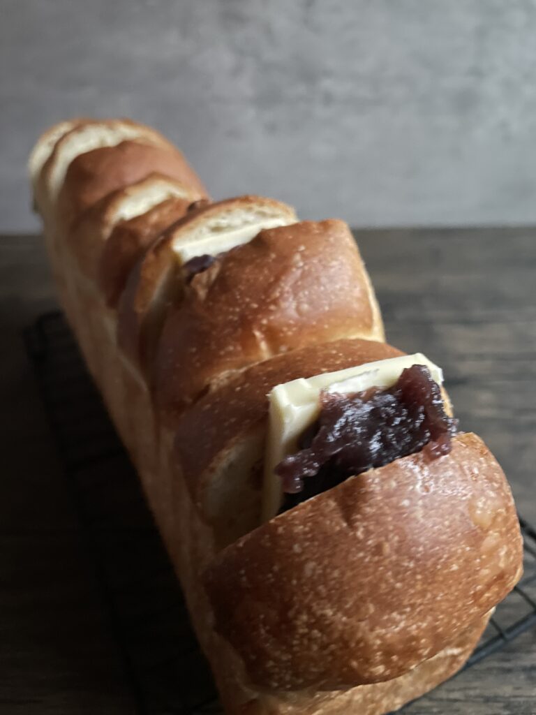 くるみ入りの生地でミニ食パンを仕上げて仕上げにあんことバターを挟みました